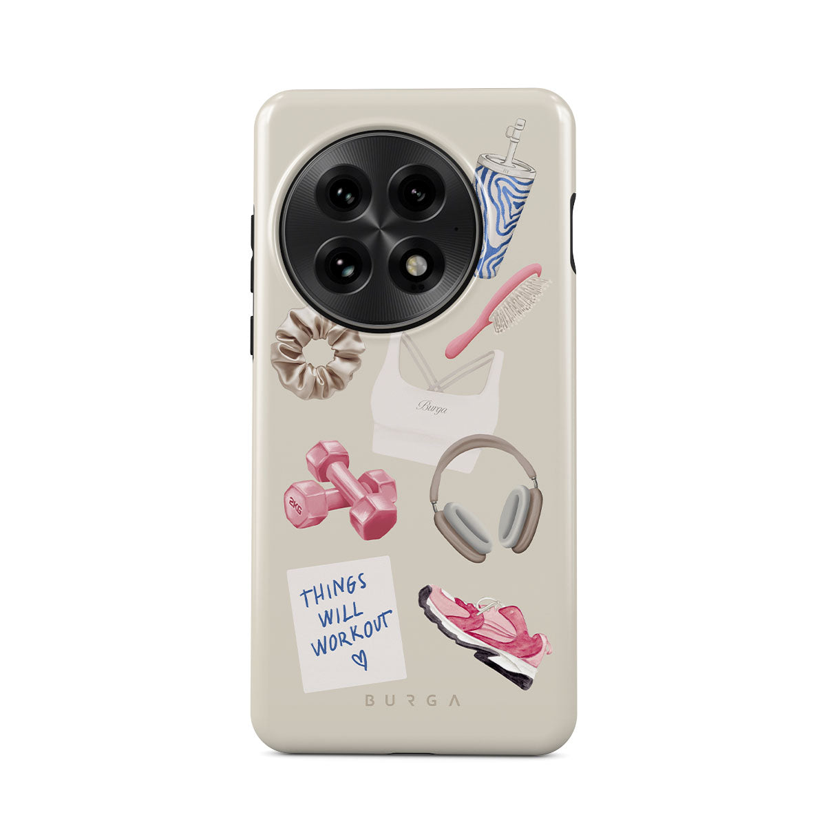 Cette collection est déclinée dans différents designs : haltères, casque audio, gourde, brosse à cheveux, baskets roses, brassière de sport, barre Crunchie, post-it « Things Will Work Out ».