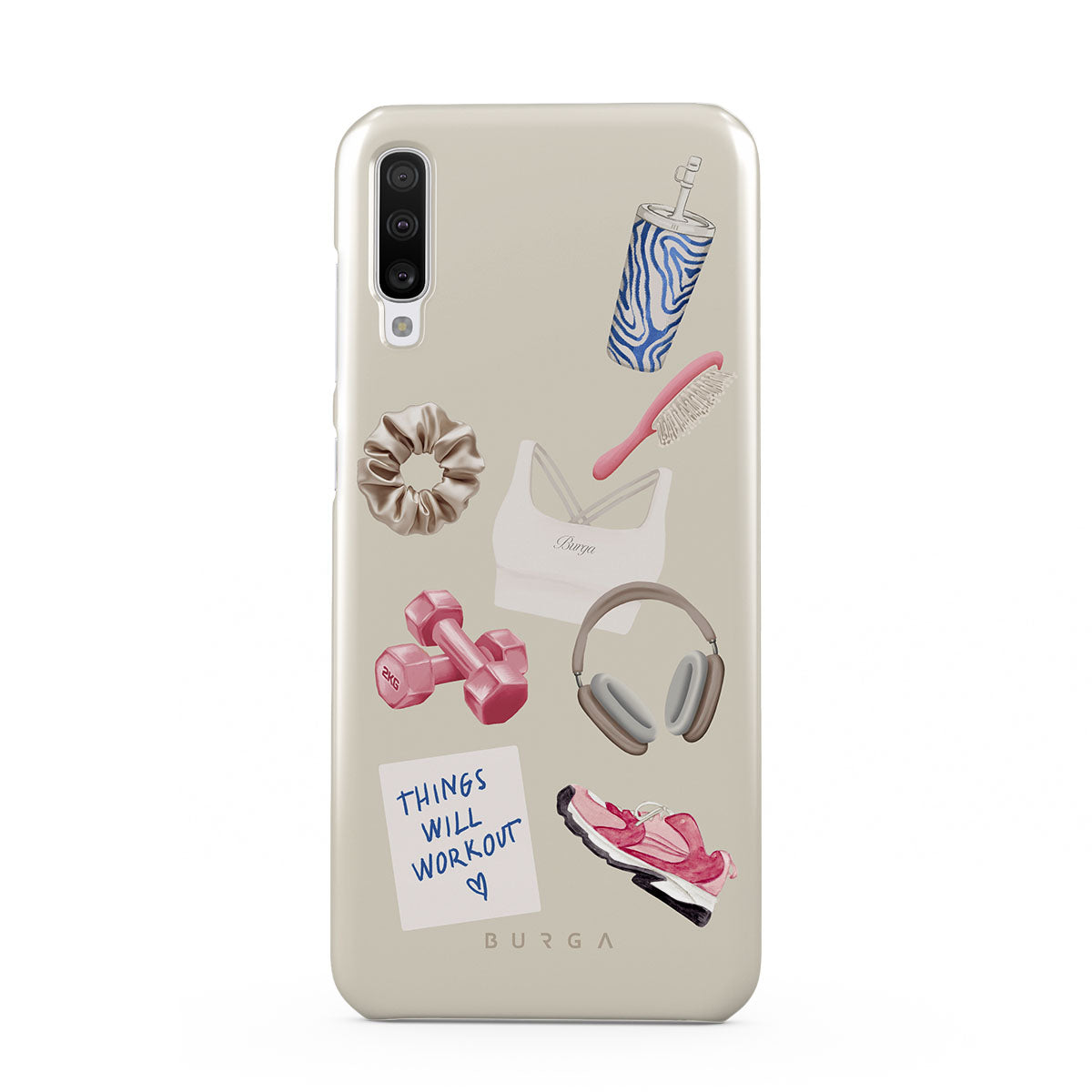 Cette collection est déclinée dans différents designs : haltères, casque audio, gourde, brosse à cheveux, baskets roses, brassière de sport, barre Crunchie, post-it « Things Will Work Out ».