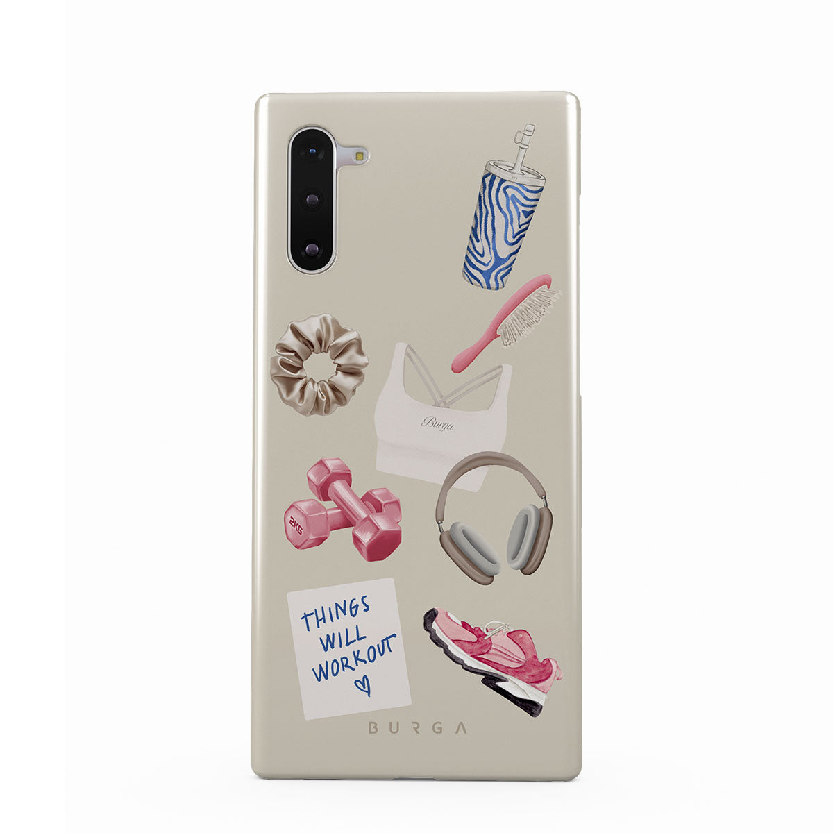 Cette collection est déclinée dans différents designs : haltères, casque audio, gourde, brosse à cheveux, baskets roses, brassière de sport, barre Crunchie, post-it « Things Will Work Out ».