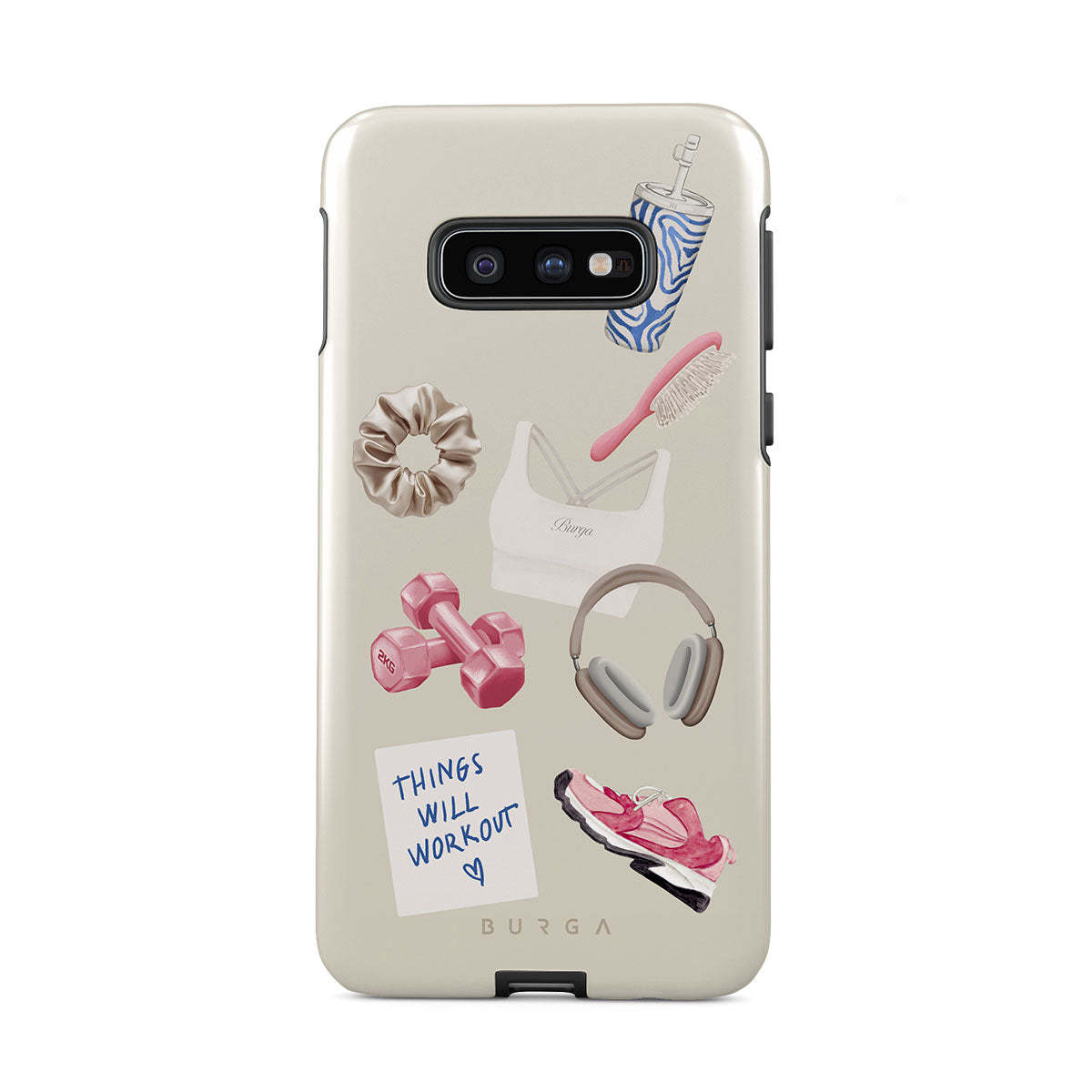 Cette collection est déclinée dans différents designs : haltères, casque audio, gourde, brosse à cheveux, baskets roses, brassière de sport, barre Crunchie, post-it « Things Will Work Out ».