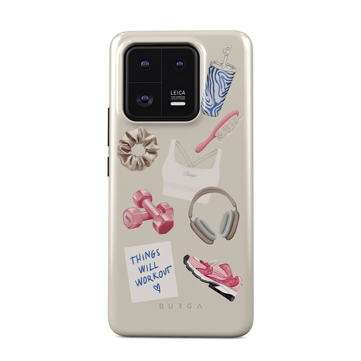 Cette collection est déclinée dans différents designs : haltères, casque audio, gourde, brosse à cheveux, baskets roses, brassière de sport, barre Crunchie, post-it « Things Will Work Out ».