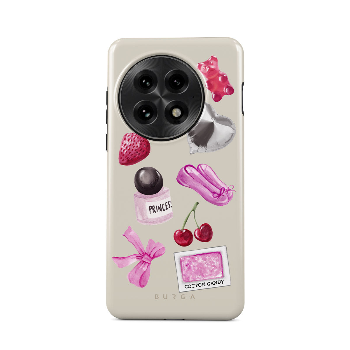 Cette collection est déclinée dans différents designs : nœud rose, ballon argenté en forme de cœur, flacon de parfum, fraise, cerises, ballerines roses, sticker barbe à papa, ourson en gomme rose.