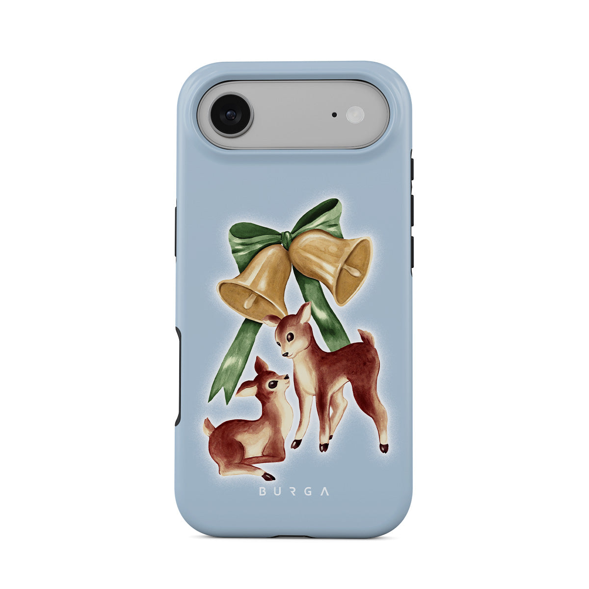 Cette collection est déclinée dans différents designs : rennes vintage, cloches de Noël, cloches dorées, illustration rétro de renne, faon, fond bleu clair