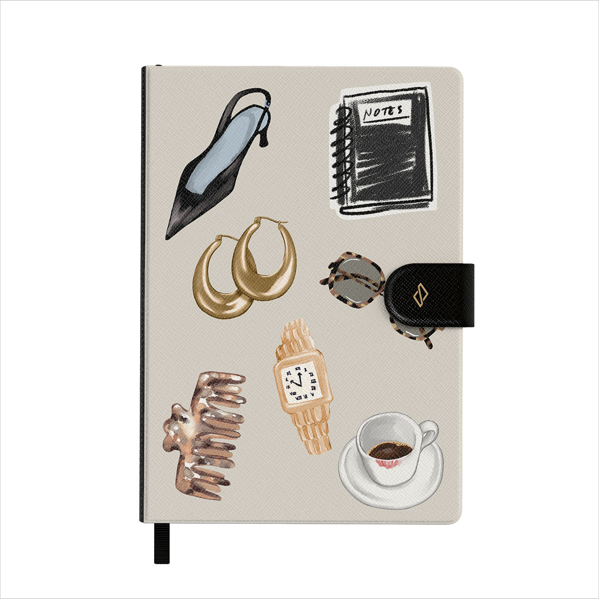 Cette collection est déclinée dans différents designs : talon haut noir, créoles dorées, carnet noir, tasse de café, lunettes écaille de tortue, chouchou marron, montre rétro dorée.