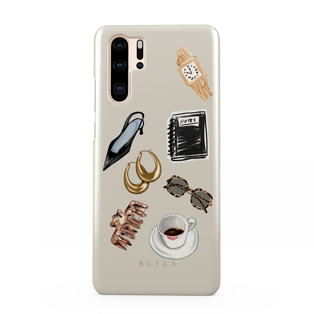 Cette collection est déclinée dans différents designs : talon haut noir, créoles dorées, carnet noir, tasse de café, lunettes écaille de tortue, chouchou marron, montre rétro dorée.