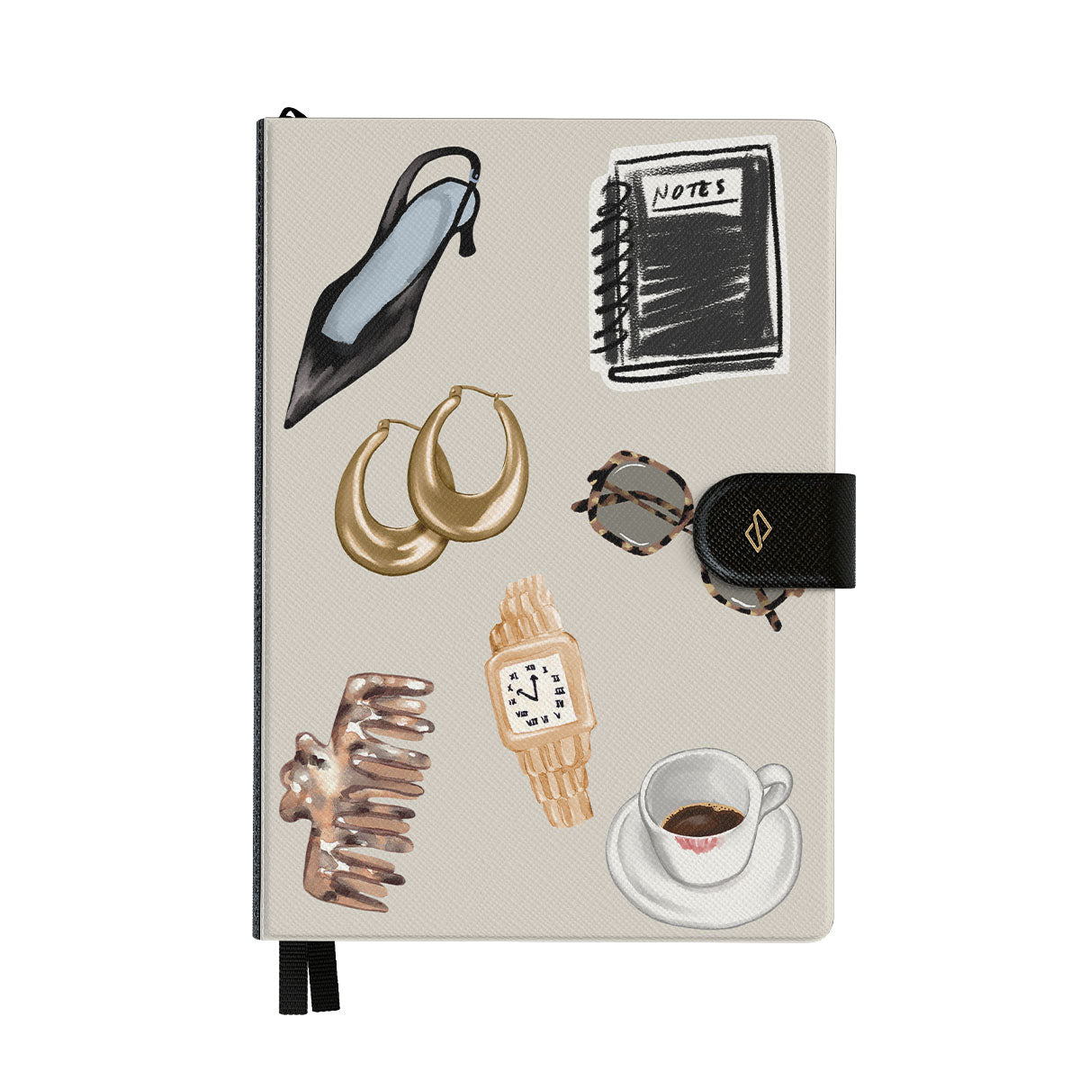 Cette collection est déclinée dans différents designs : talon haut noir, créoles dorées, carnet noir, tasse de café, lunettes écaille de tortue, chouchou marron, montre rétro dorée.