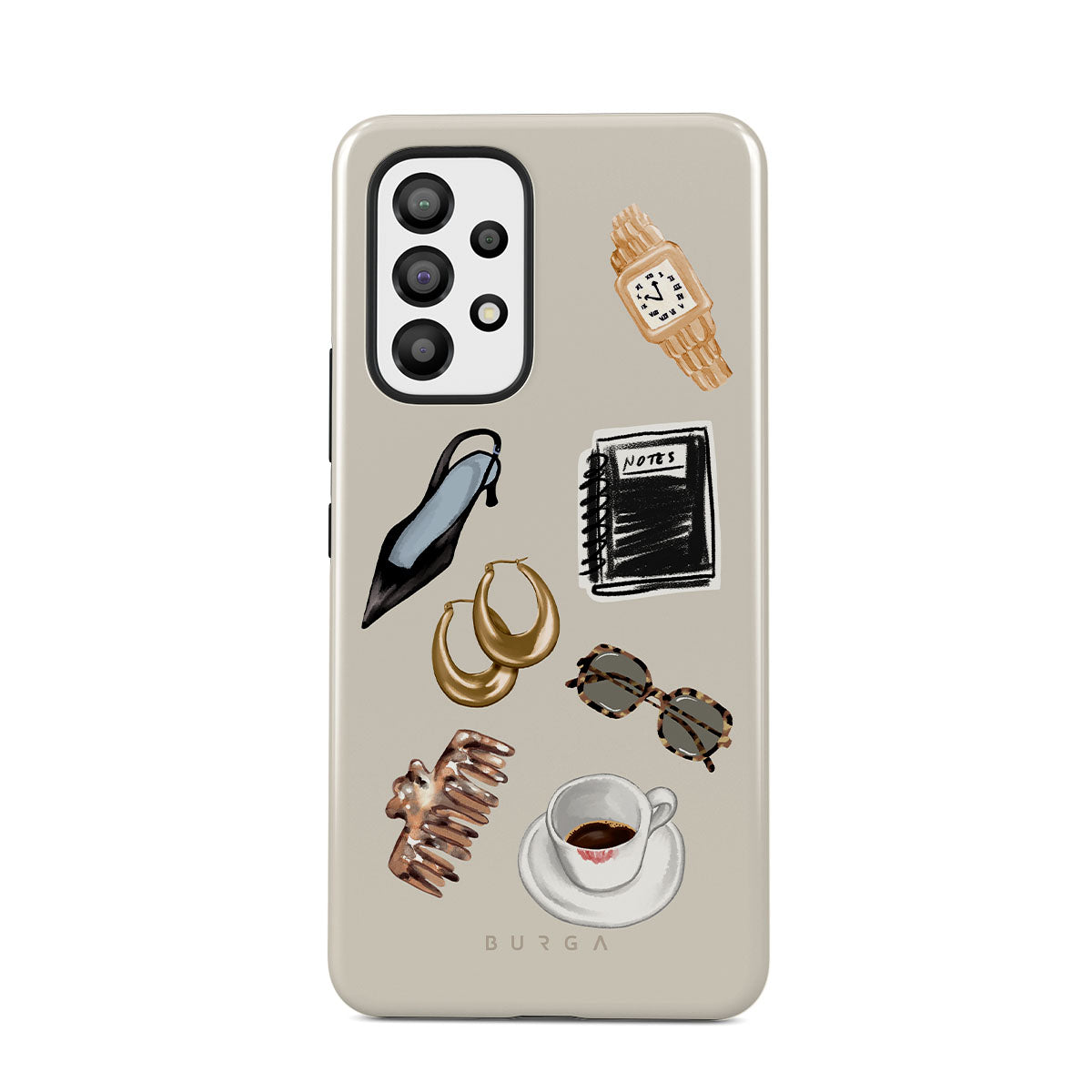 Cette collection est déclinée dans différents designs : talon haut noir, créoles dorées, carnet noir, tasse de café, lunettes écaille de tortue, chouchou marron, montre rétro dorée.