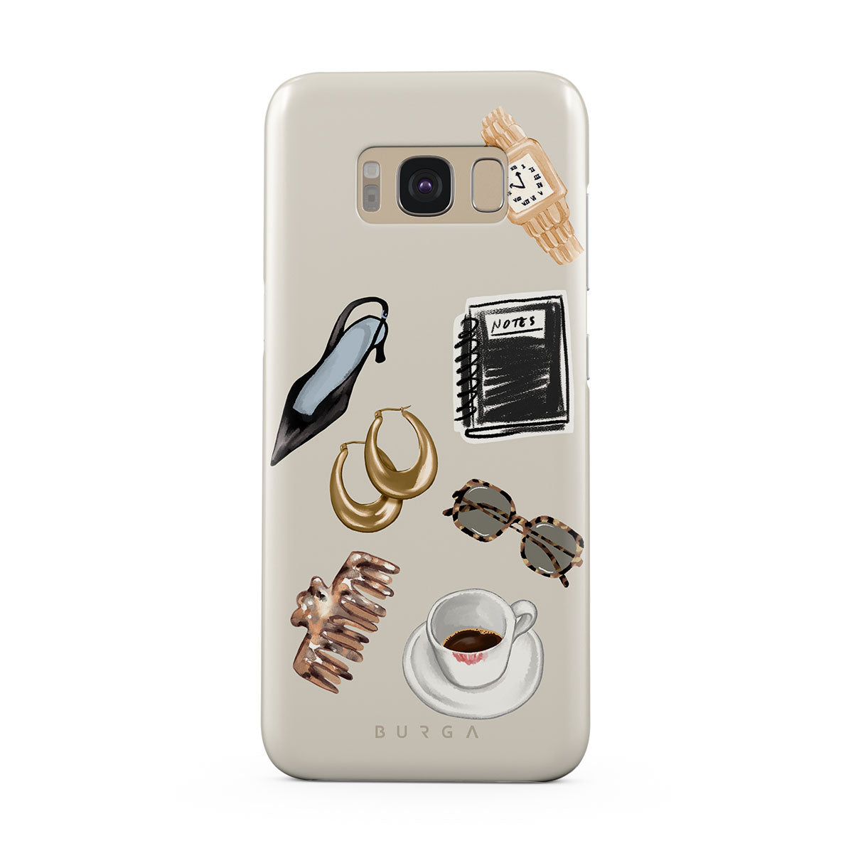 Cette collection est déclinée dans différents designs : talon haut noir, créoles dorées, carnet noir, tasse de café, lunettes écaille de tortue, chouchou marron, montre rétro dorée.