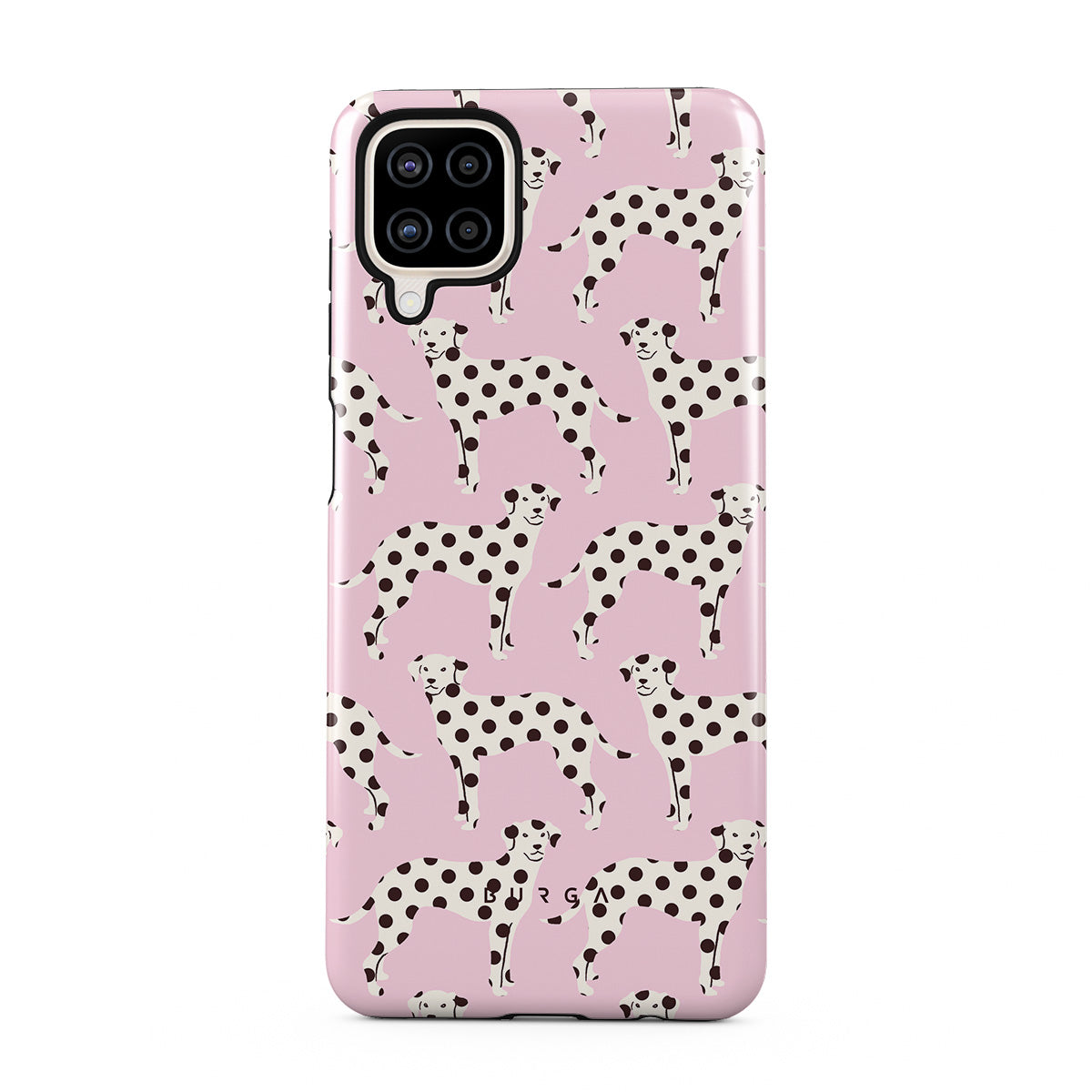 Cette collection est déclinée dans différents designs : des dalmatiens sur un fond rose bébé.