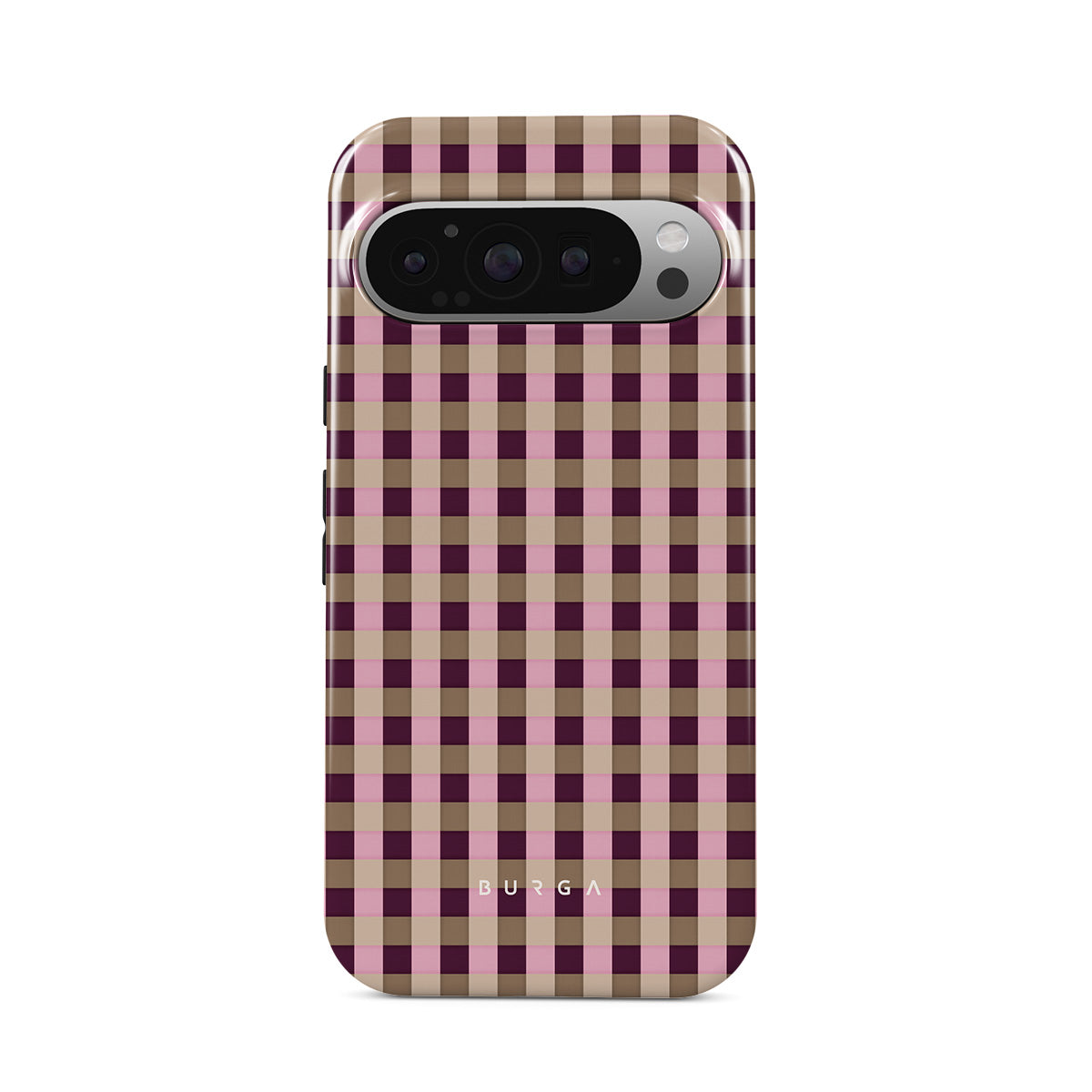 Cette collection est déclinée dans différents designs : un motif à carreaux rose et bordeaux, dans un style moderne.
