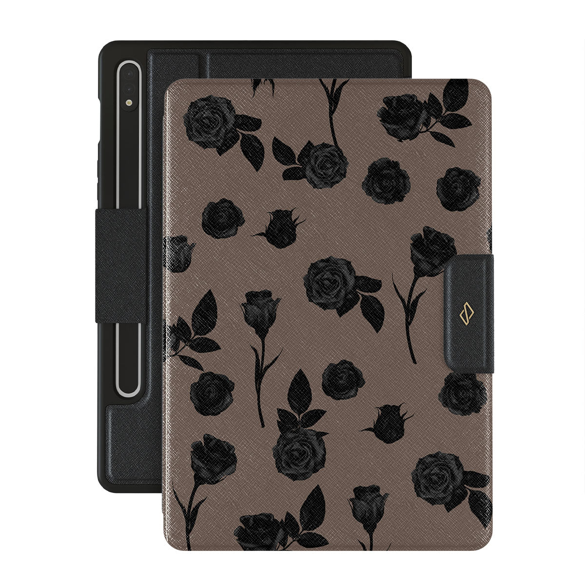 Ce design présente : des roses noires, des tons terreux, des détails floraux, des fleurs sombres.