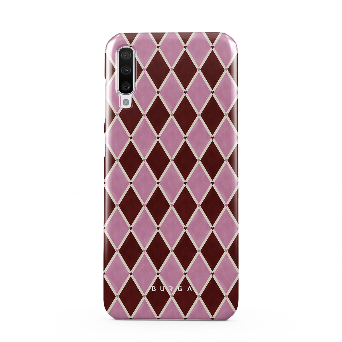 Cette collection est déclinée dans différents designs : motif arlequin, losanges roses, fond rouge profond