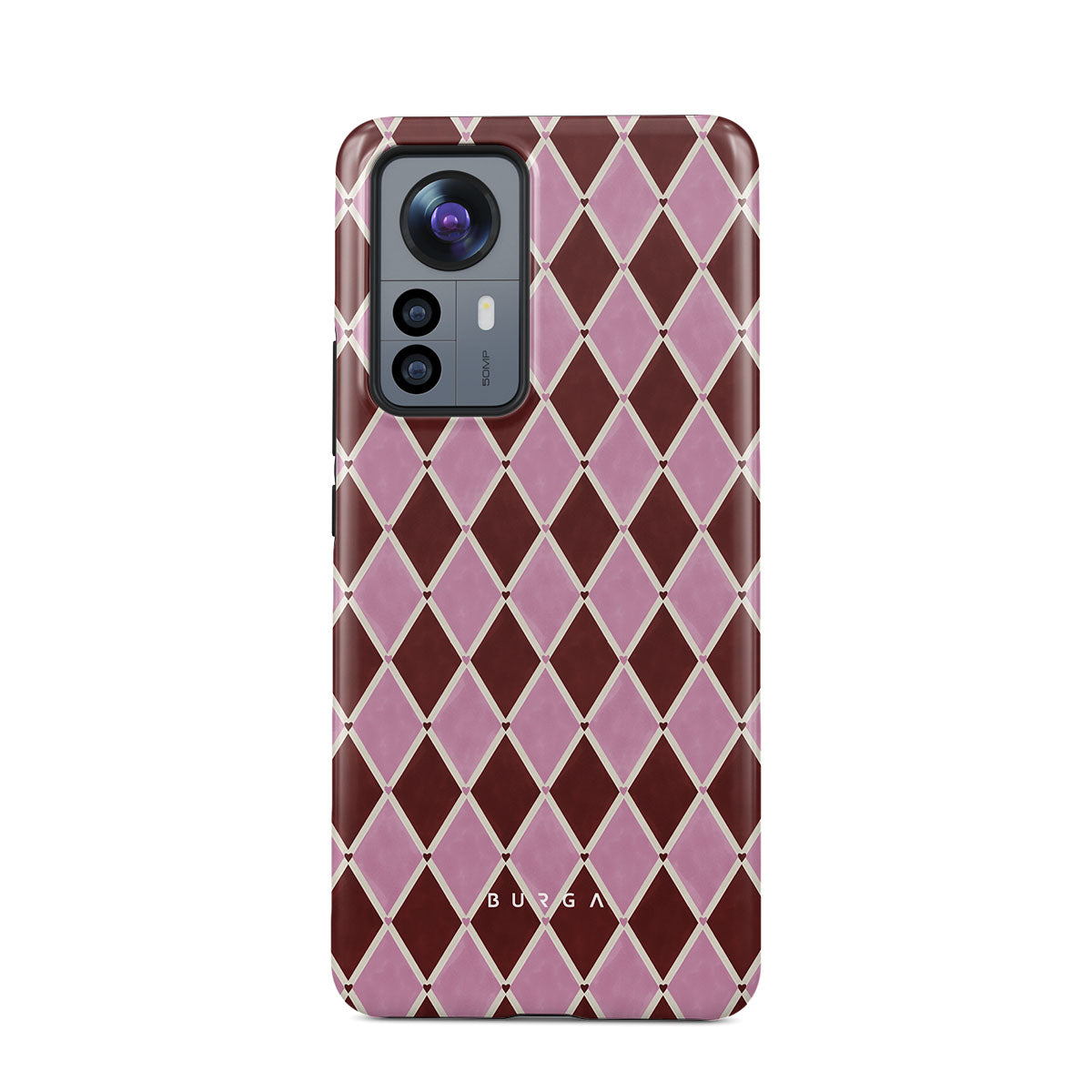 Cette collection est déclinée dans différents designs : motif arlequin, losanges roses, fond rouge profond