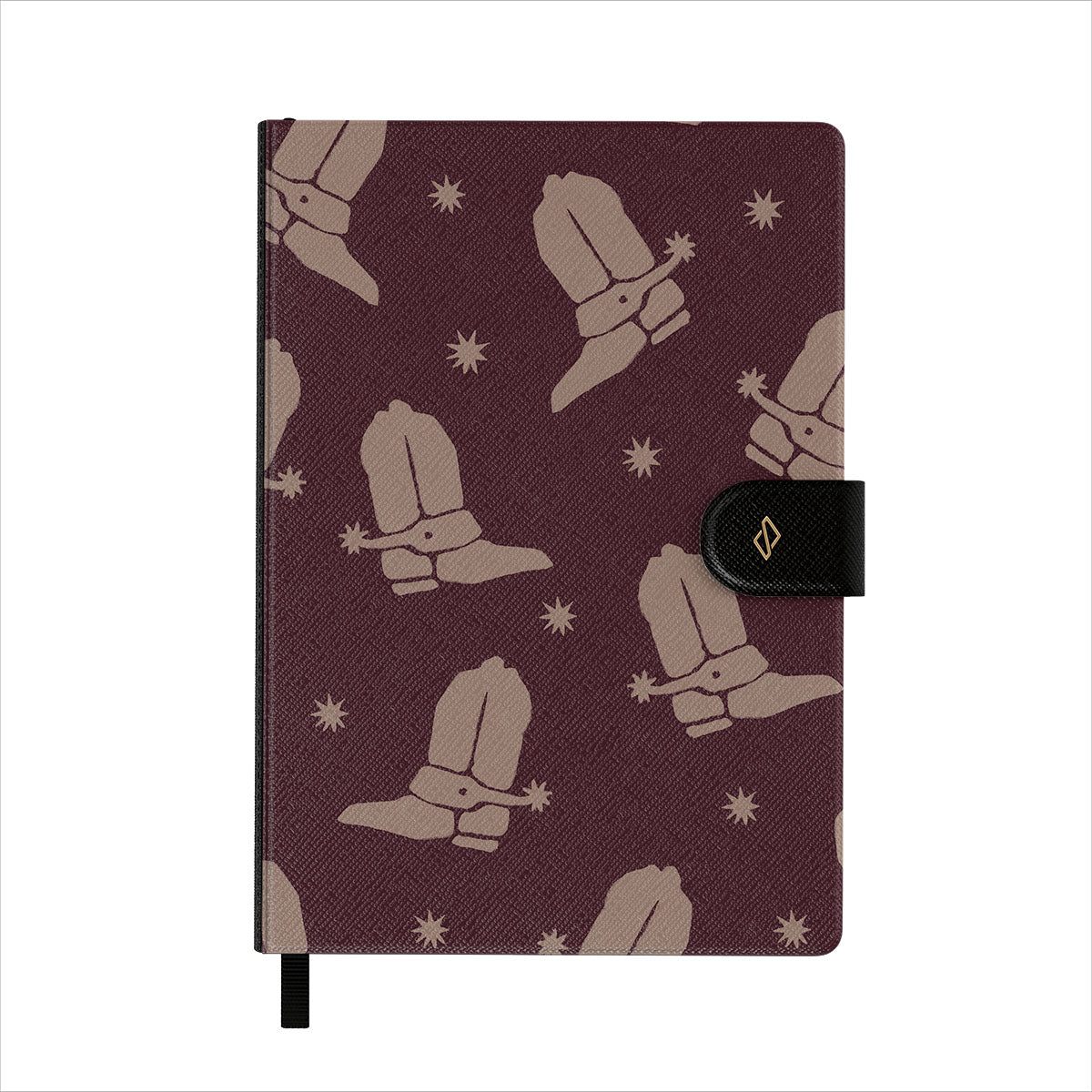 La couverture en simili cuir vegan est imprimée de motifs tendances BURGA. Le carnet est aussi doté d’un élégant ruban marque-page noir.