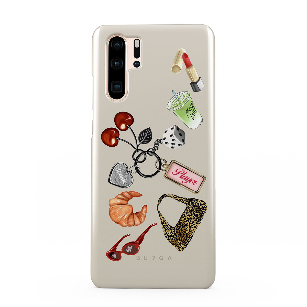 Cette collection est déclinée dans différents designs : lunettes de soleil rouges, rouge à lèvres rouge, matcha vert, croissant, dés noirs, sac imprimé léopard, porte-clés avec cœur argenté, cerises, dés et étiquette « Player ».