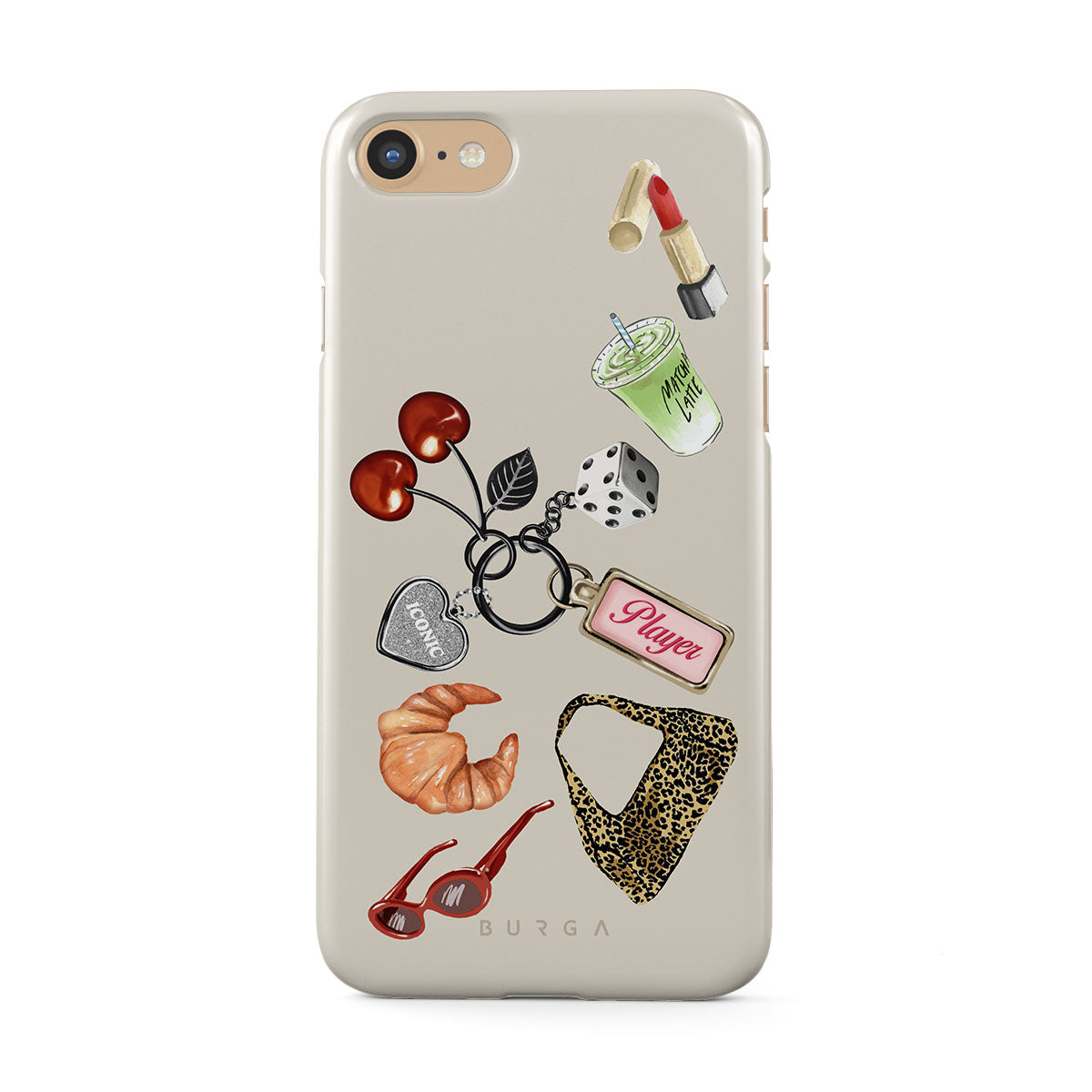 Cette collection est déclinée dans différents designs : lunettes de soleil rouges, rouge à lèvres rouge, matcha vert, croissant, dés noirs, sac imprimé léopard, porte-clés avec cœur argenté, cerises, dés et étiquette « Player ».
