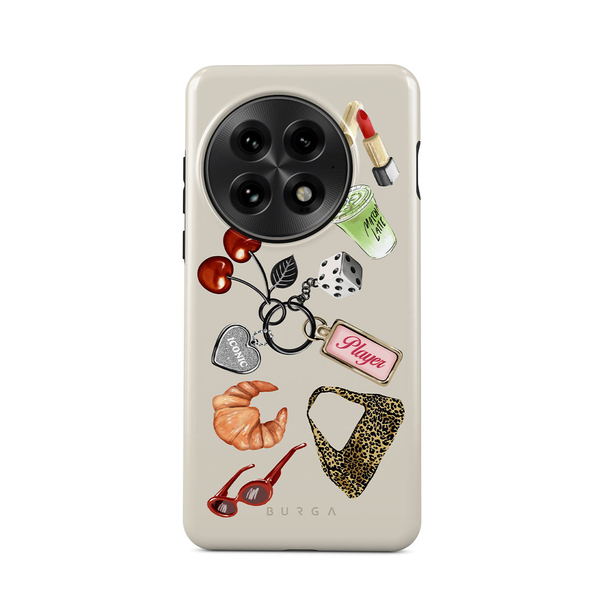 Cette collection est déclinée dans différents designs : lunettes de soleil rouges, rouge à lèvres rouge, matcha vert, croissant, dés noirs, sac imprimé léopard, porte-clés avec cœur argenté, cerises, dés et étiquette « Player ».