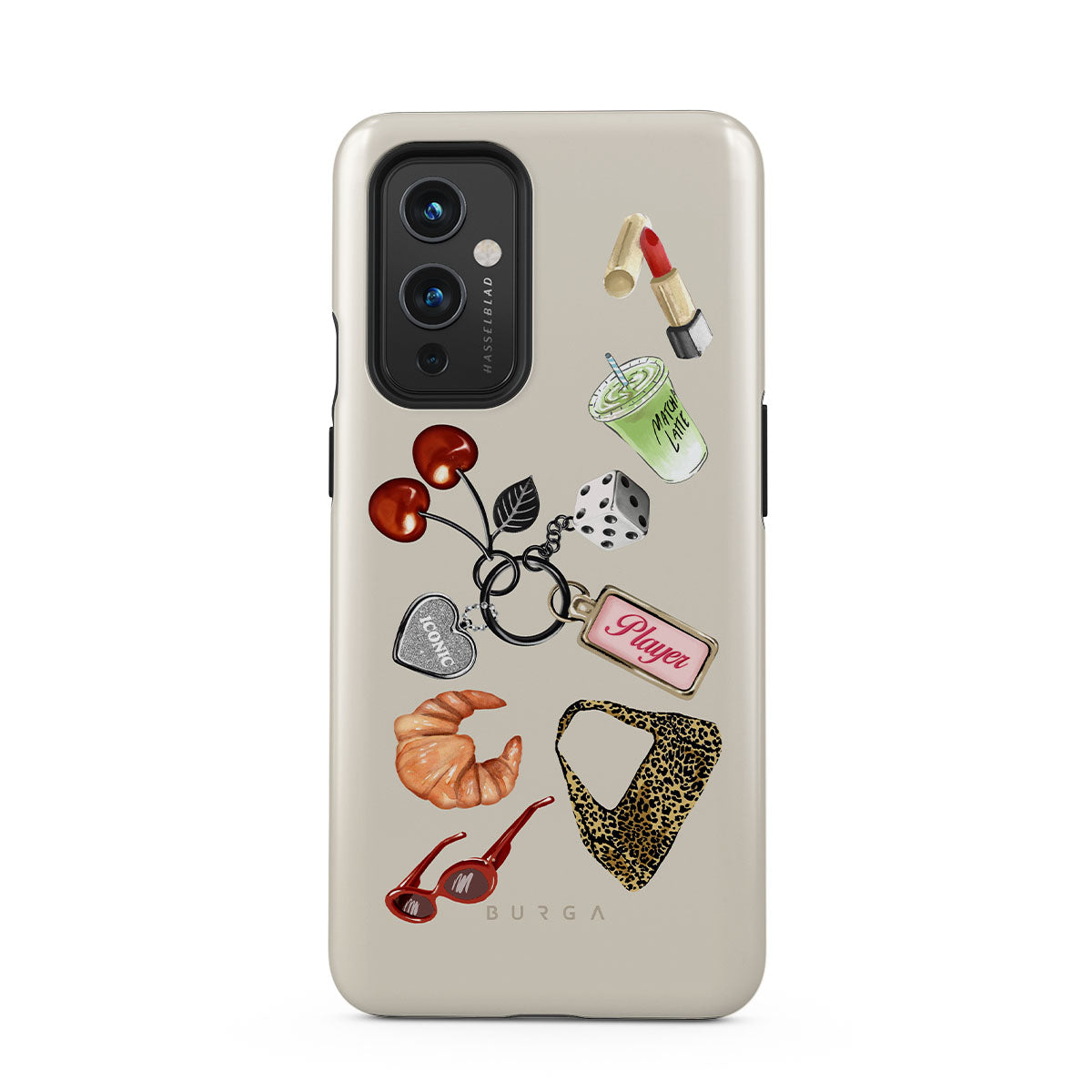 Cette collection est déclinée dans différents designs : lunettes de soleil rouges, rouge à lèvres rouge, matcha vert, croissant, dés noirs, sac imprimé léopard, porte-clés avec cœur argenté, cerises, dés et étiquette « Player ».