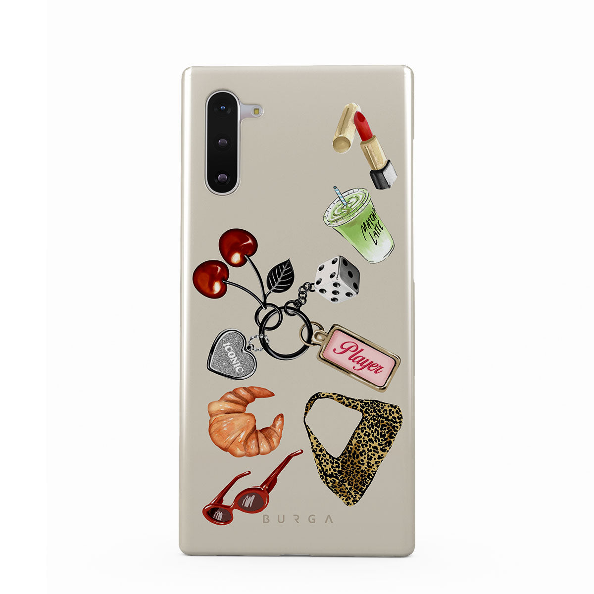 Cette collection est déclinée dans différents designs : lunettes de soleil rouges, rouge à lèvres rouge, matcha vert, croissant, dés noirs, sac imprimé léopard, porte-clés avec cœur argenté, cerises, dés et étiquette « Player ».
