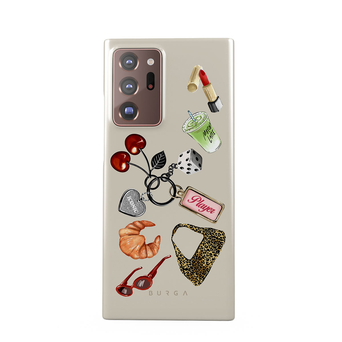 Cette collection est déclinée dans différents designs : lunettes de soleil rouges, rouge à lèvres rouge, matcha vert, croissant, dés noirs, sac imprimé léopard, porte-clés avec cœur argenté, cerises, dés et étiquette « Player ».