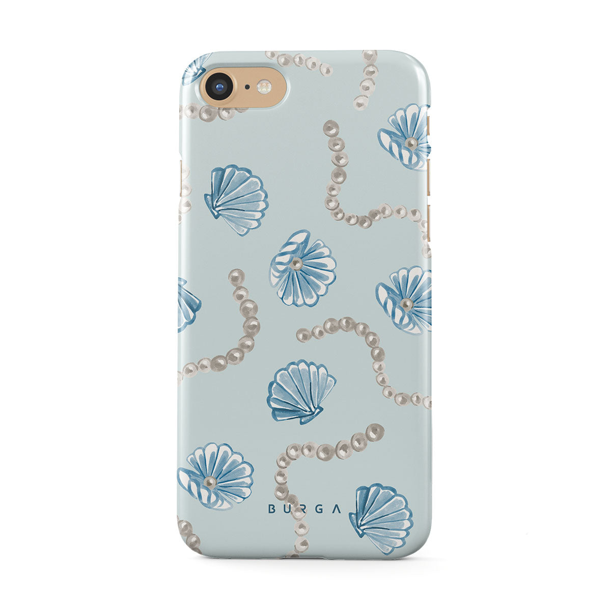 Cette collection est déclinée dans différents designs : perles, coquillages, fond bleu clair, éléments marins.