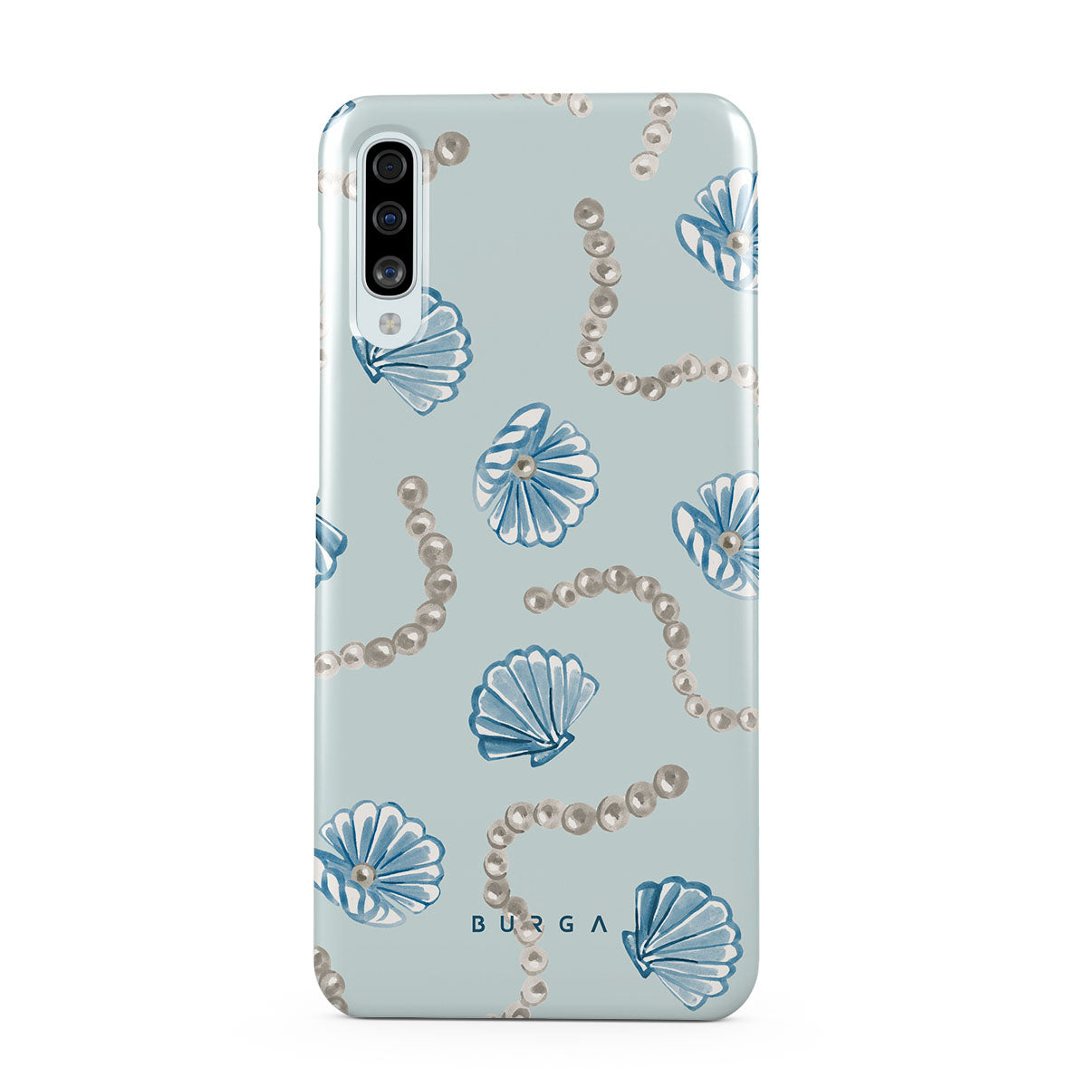 Cette collection est déclinée dans différents designs : perles, coquillages, fond bleu clair, éléments marins.
