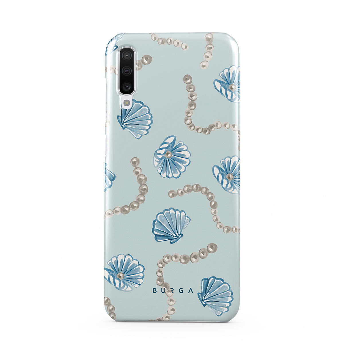 Cette collection est déclinée dans différents designs : perles, coquillages, fond bleu clair, éléments marins.