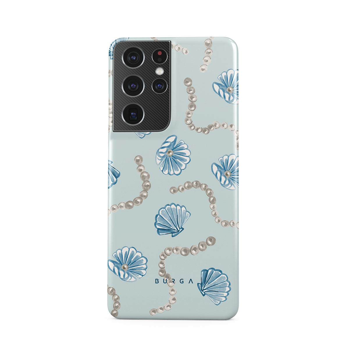 Cette collection est déclinée dans différents designs : perles, coquillages, fond bleu clair, éléments marins.