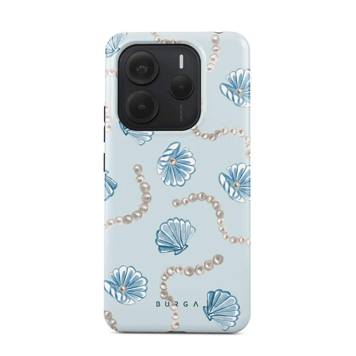 Cette collection est déclinée dans différents designs : perles, coquillages, fond bleu clair, éléments marins.