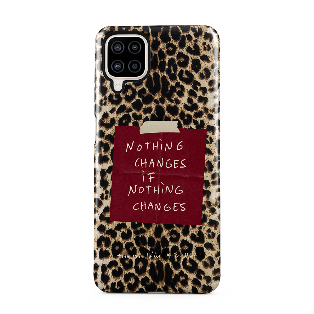 Ce modèle présente : texte cursif, citation, post-it rouge, imprimé animalier.