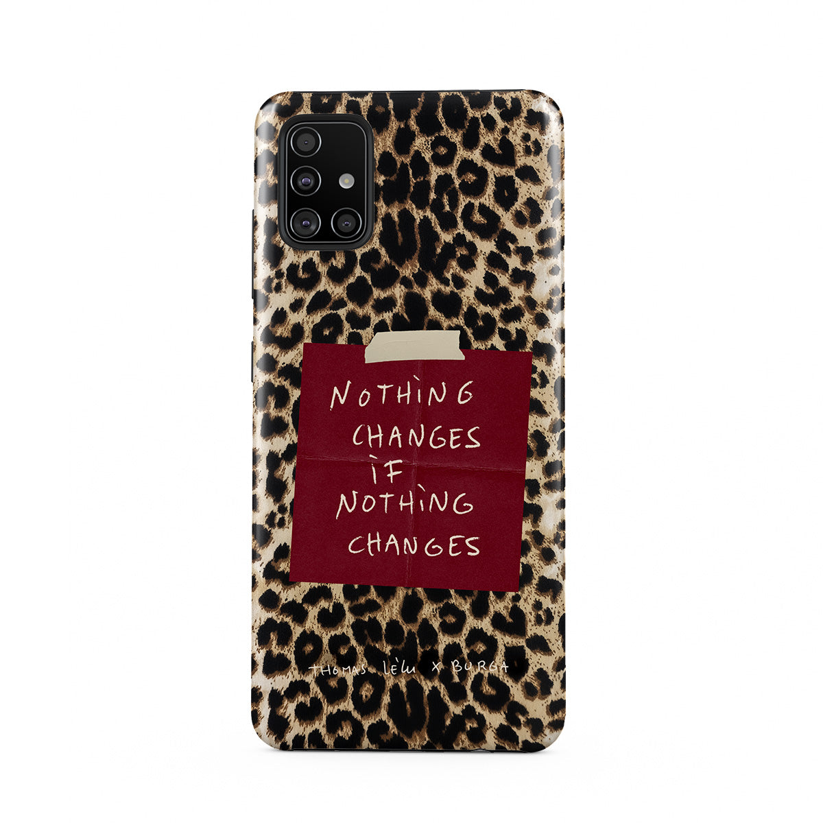 Ce modèle présente : texte cursif, citation, post-it rouge, imprimé animalier.