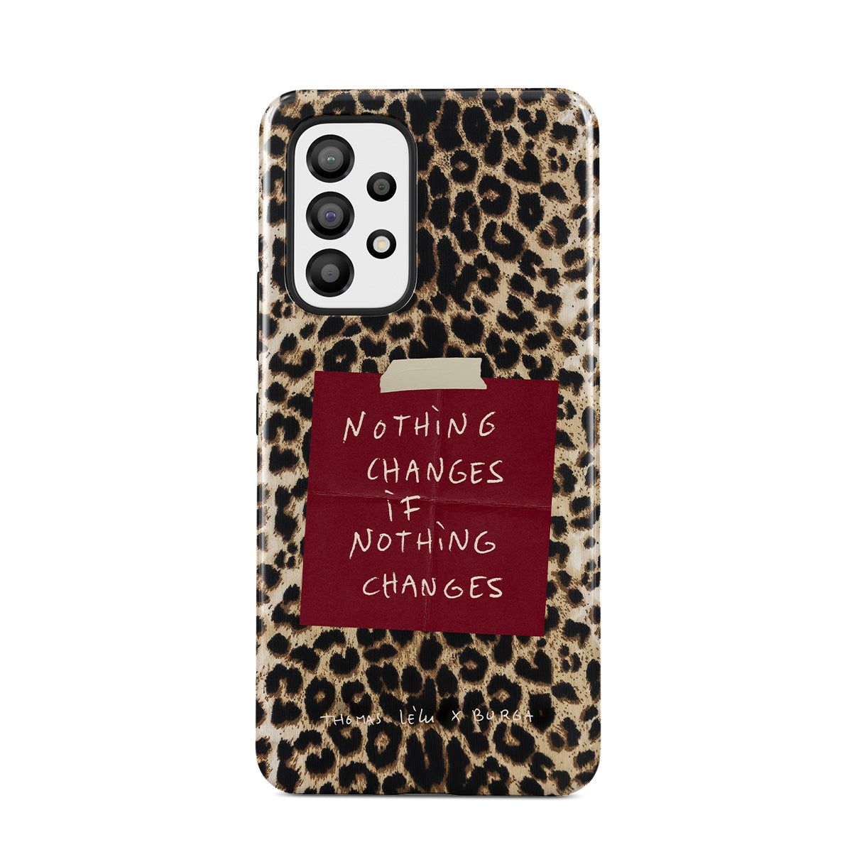 Ce modèle présente : texte cursif, citation, post-it rouge, imprimé animalier.