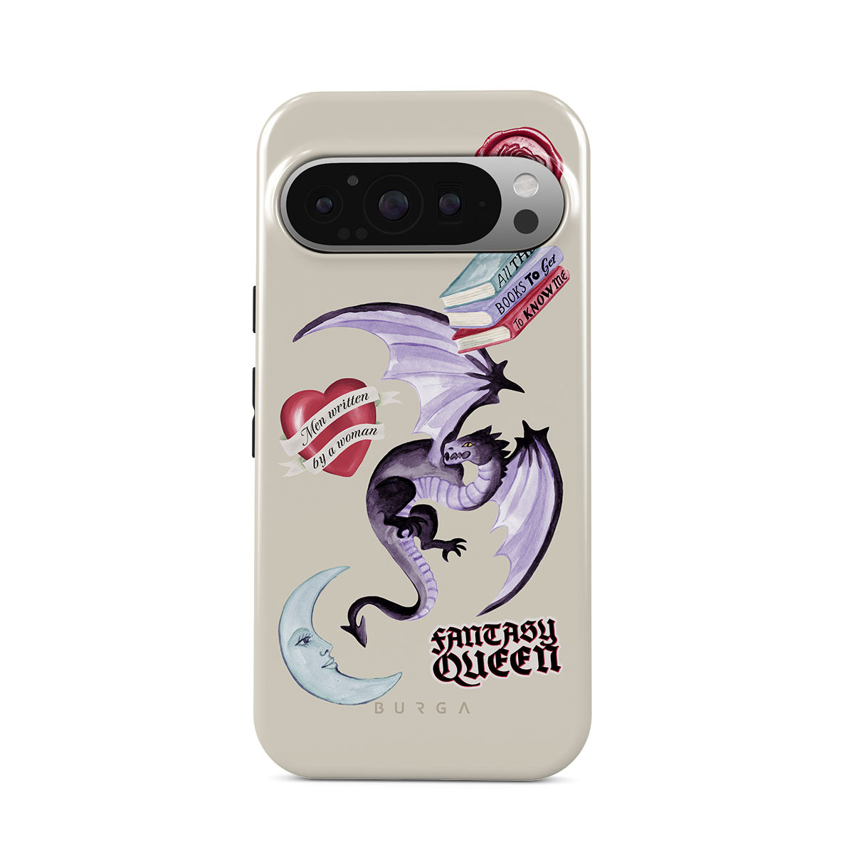 Cette collection est déclinée dans différents designs : dragon violet, sticker « Fantasy Queen », croissant de lune, cachet de cire violet, cœur avec message, livres.