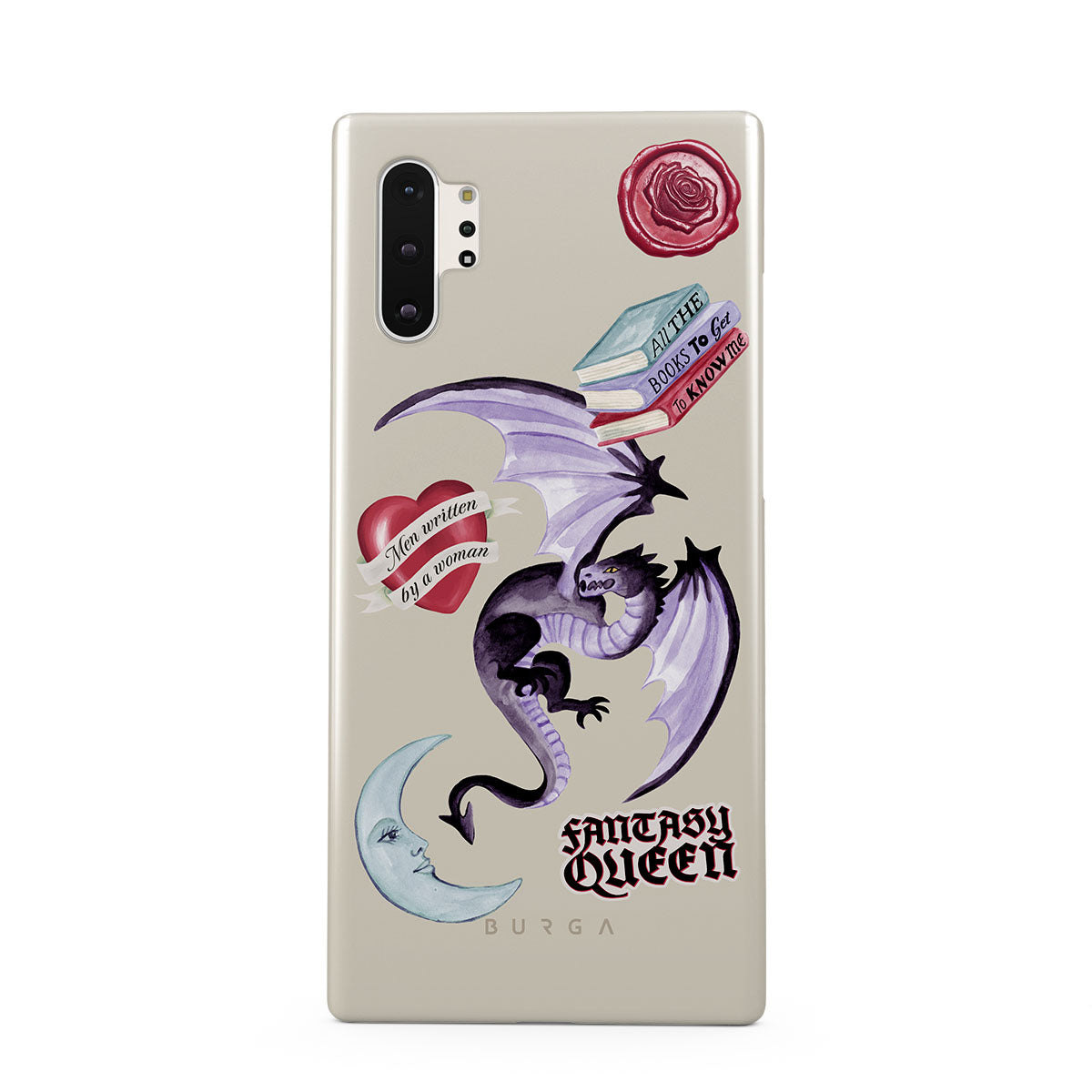 Cette collection est déclinée dans différents designs : dragon violet, sticker « Fantasy Queen », croissant de lune, cachet de cire violet, cœur avec message, livres.