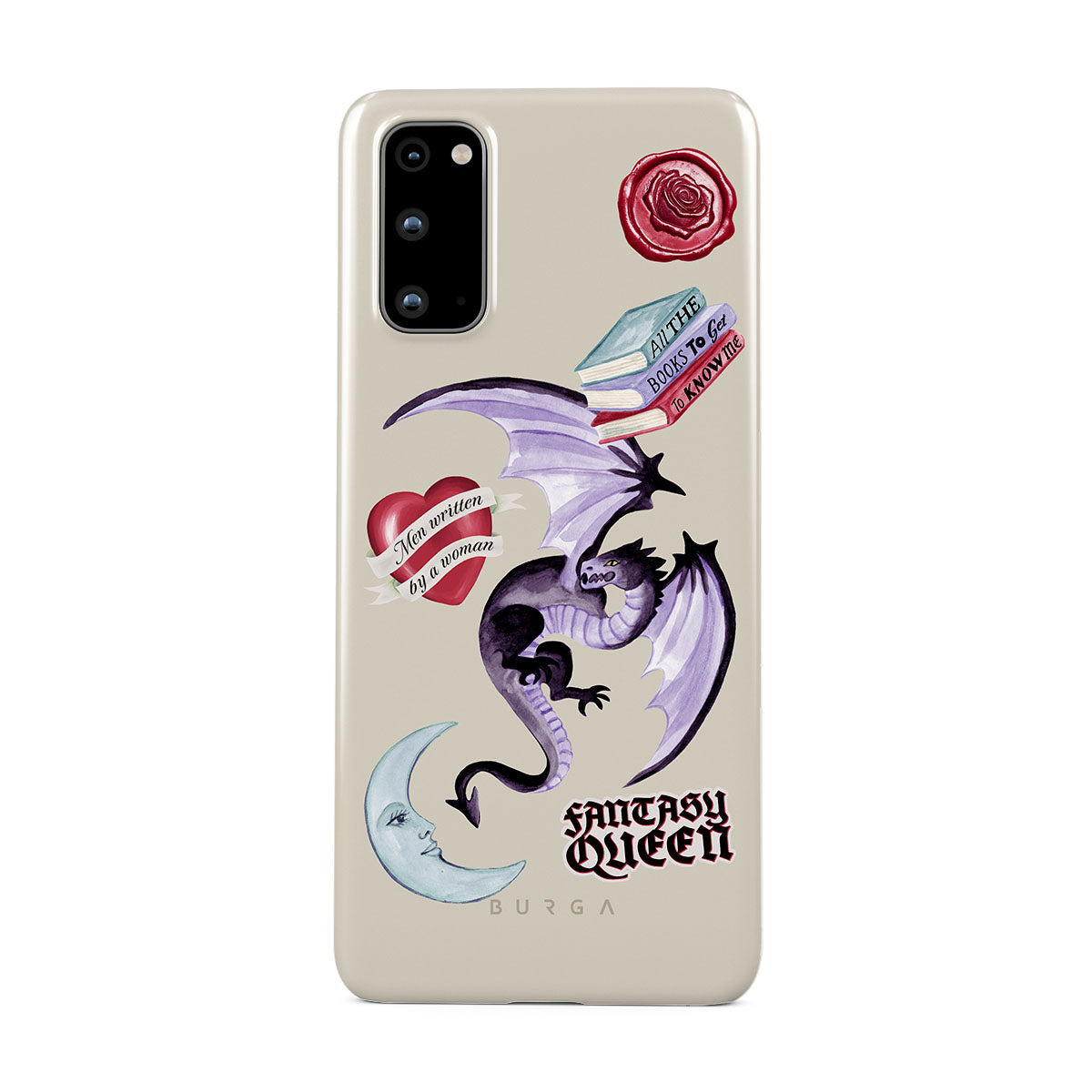 Cette collection est déclinée dans différents designs : dragon violet, sticker « Fantasy Queen », croissant de lune, cachet de cire violet, cœur avec message, livres.