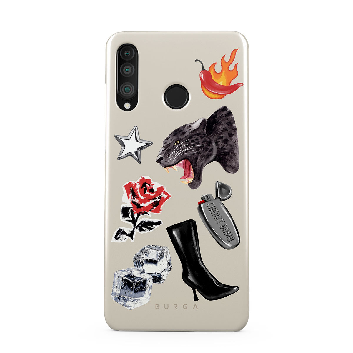 Cette collection est déclinée dans différents designs : panthère noire, rose rouge, poivron enflammé, briquet argenté, bottes noires montantes, glaçons, étoile argentée.