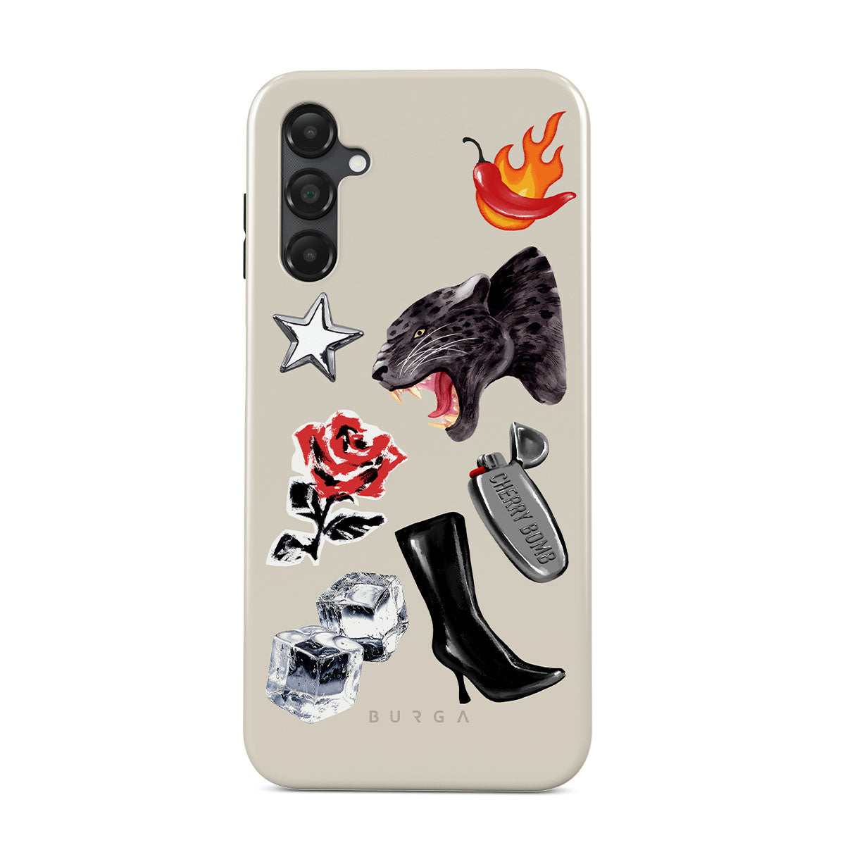Cette collection est déclinée dans différents designs : panthère noire, rose rouge, poivron enflammé, briquet argenté, bottes noires montantes, glaçons, étoile argentée.