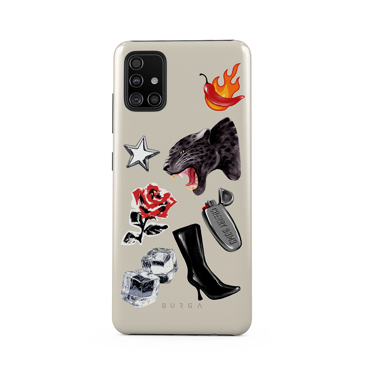 Cette collection est déclinée dans différents designs : panthère noire, rose rouge, poivron enflammé, briquet argenté, bottes noires montantes, glaçons, étoile argentée.