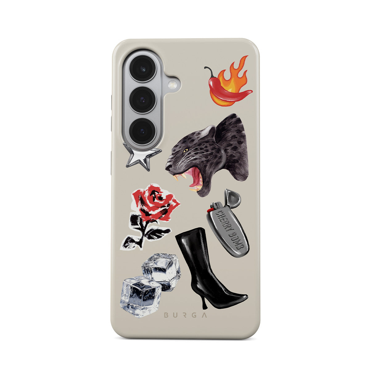 Cette collection est déclinée dans différents designs : panthère noire, rose rouge, poivron enflammé, briquet argenté, bottes noires montantes, glaçons, étoile argentée.