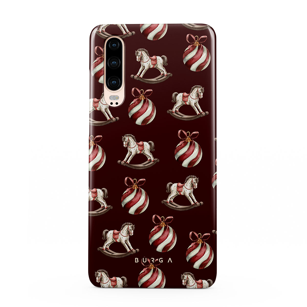 Les éléments principaux : chevaux à bascule, boules, rouge, décor de Noël