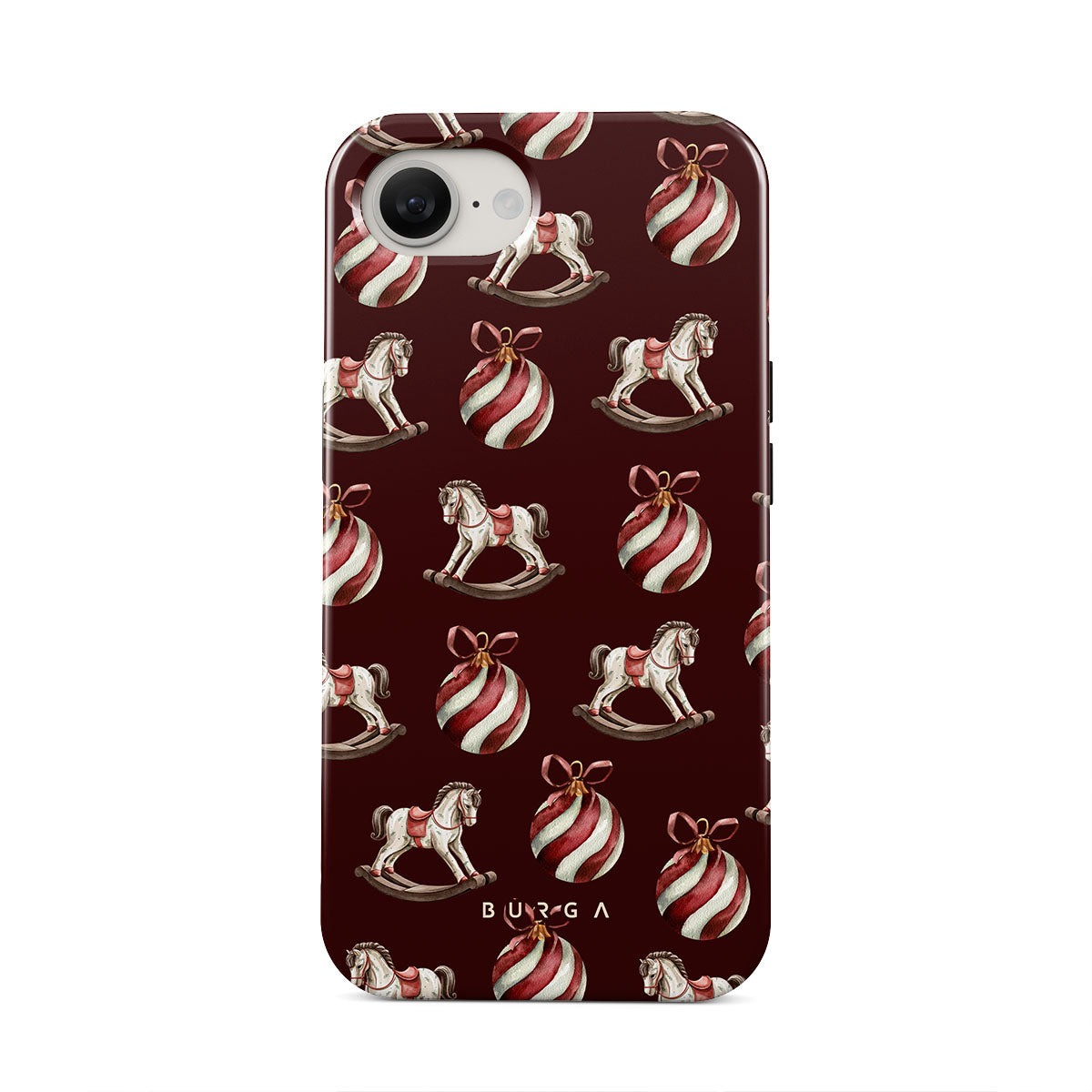 Les éléments principaux : chevaux à bascule, boules, rouge, décor de Noël