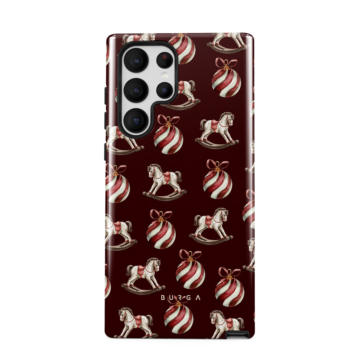 Les éléments principaux : chevaux à bascule, boules, rouge, décor de Noël