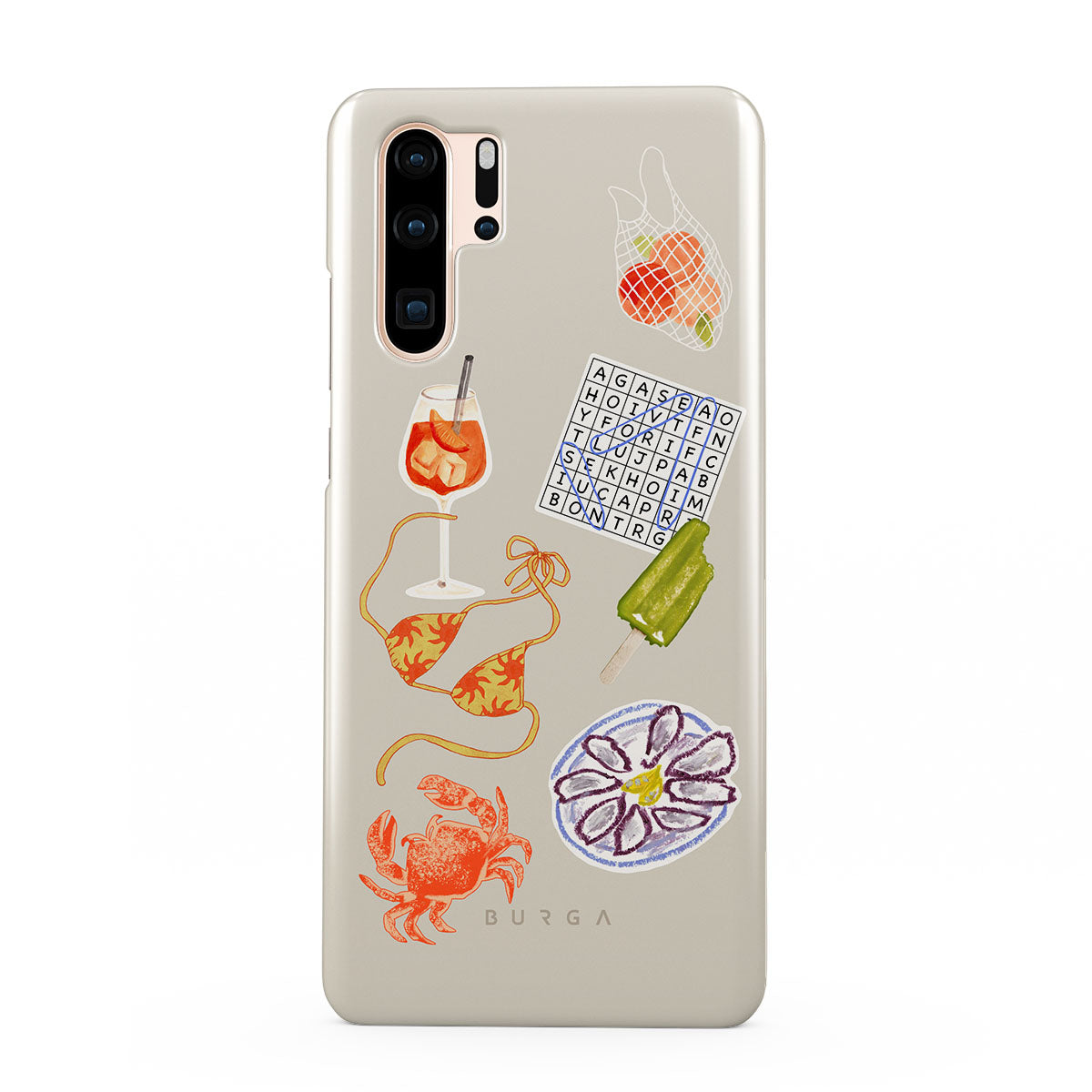 Cette collection est déclinée dans différents designs : crabe, assiette d’huîtres, glace, mots croisés, cocktail spritz, haut de bikini, fruits.
