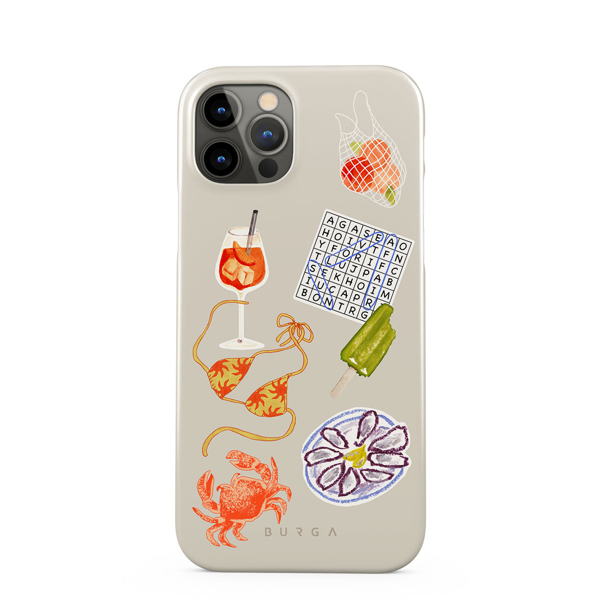 Cette collection est déclinée dans différents designs : crabe, assiette d’huîtres, glace, mots croisés, cocktail spritz, haut de bikini, fruits.