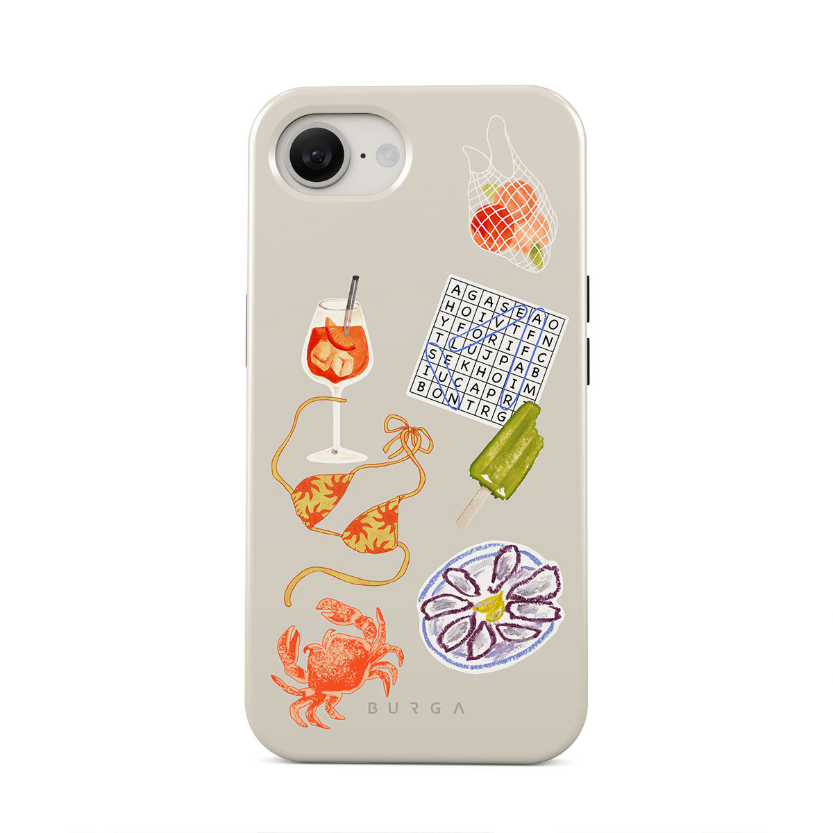 Cette collection est déclinée dans différents designs : crabe, assiette d’huîtres, glace, mots croisés, cocktail spritz, haut de bikini, fruits.