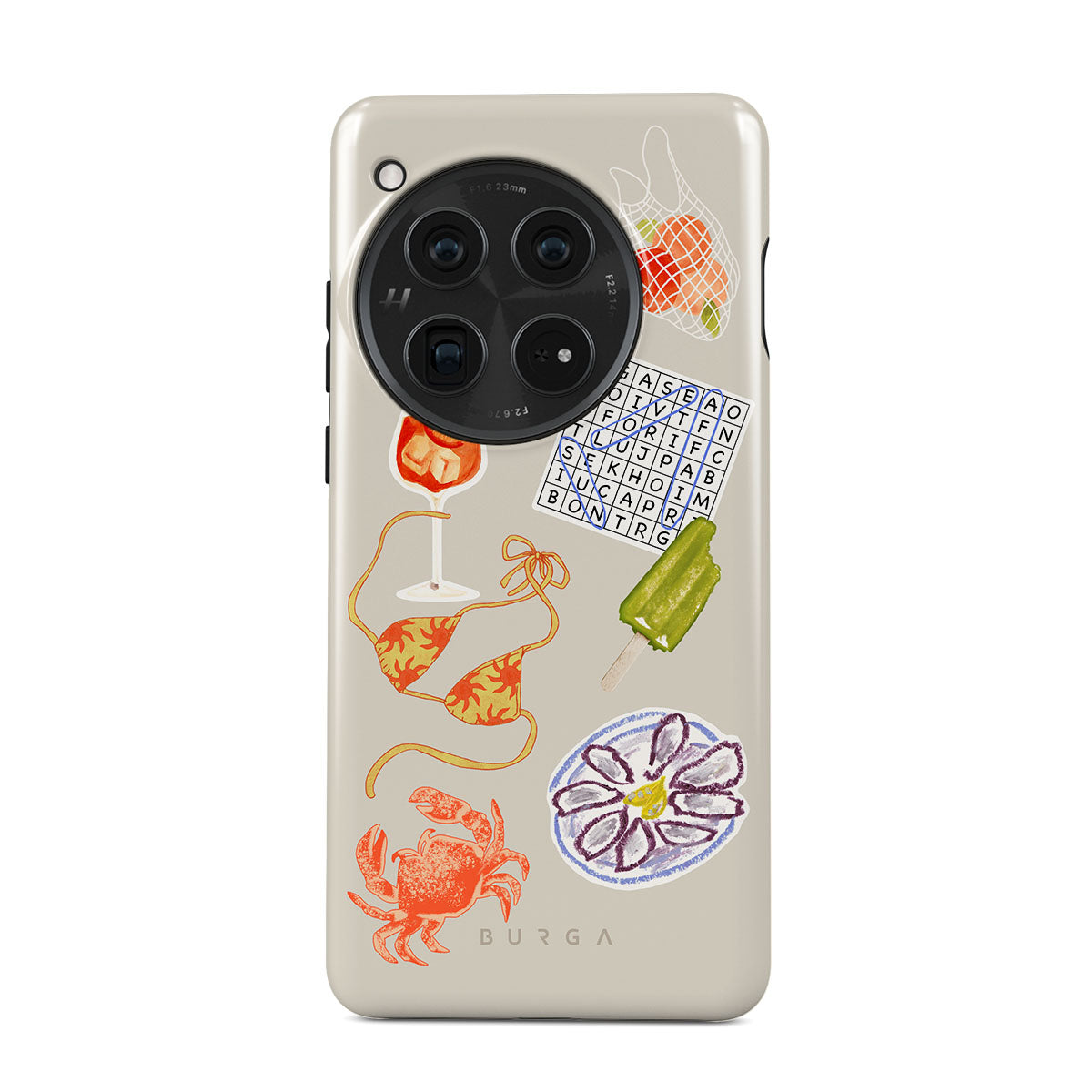 Cette collection est déclinée dans différents designs : crabe, assiette d’huîtres, glace, mots croisés, cocktail spritz, haut de bikini, fruits.