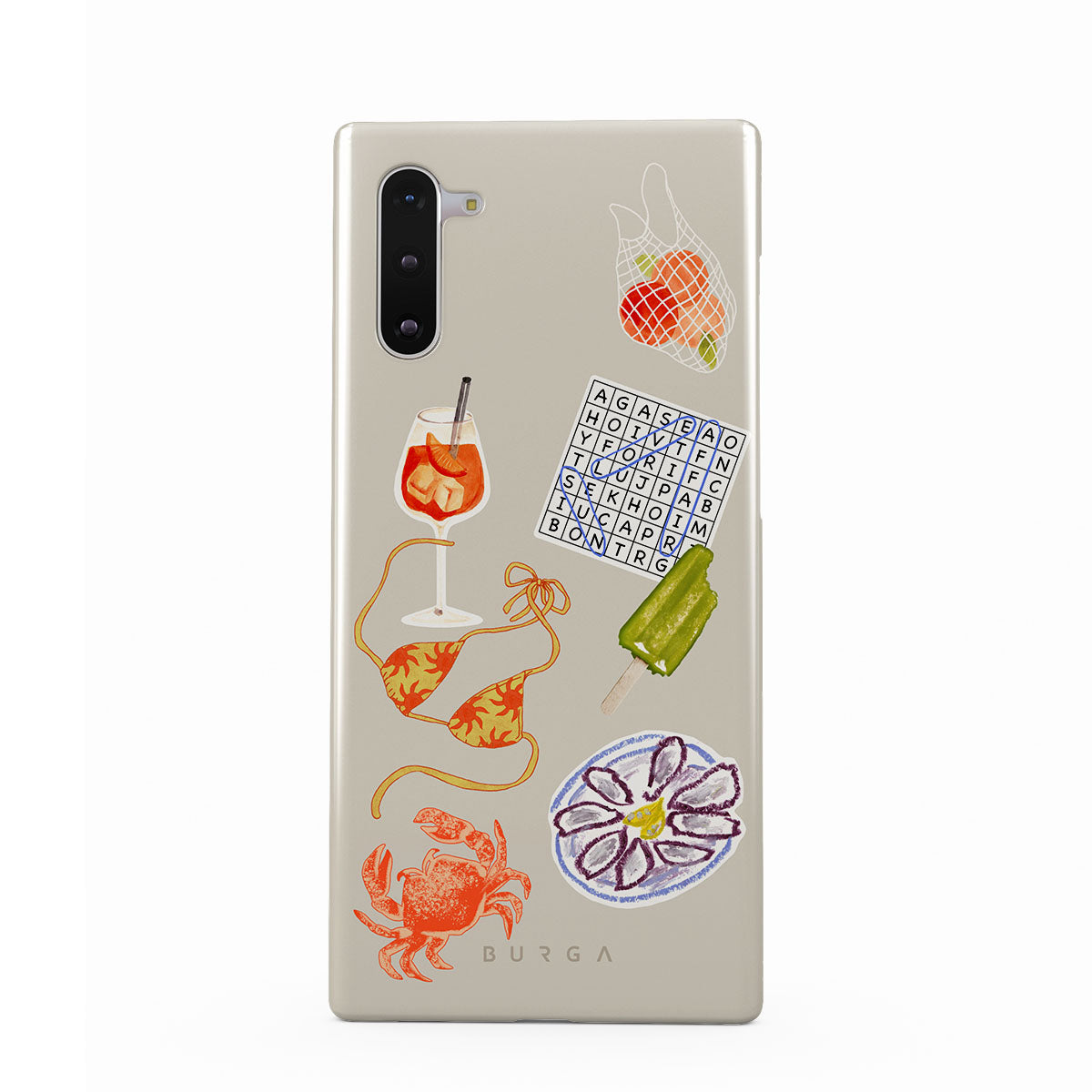 Cette collection est déclinée dans différents designs : crabe, assiette d’huîtres, glace, mots croisés, cocktail spritz, haut de bikini, fruits.
