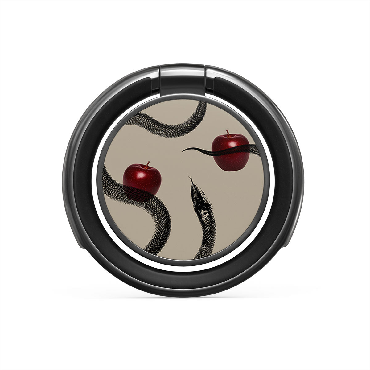 Ce design présente : des pommes rouges brillantes, des serpents enroulés, des tons beige.