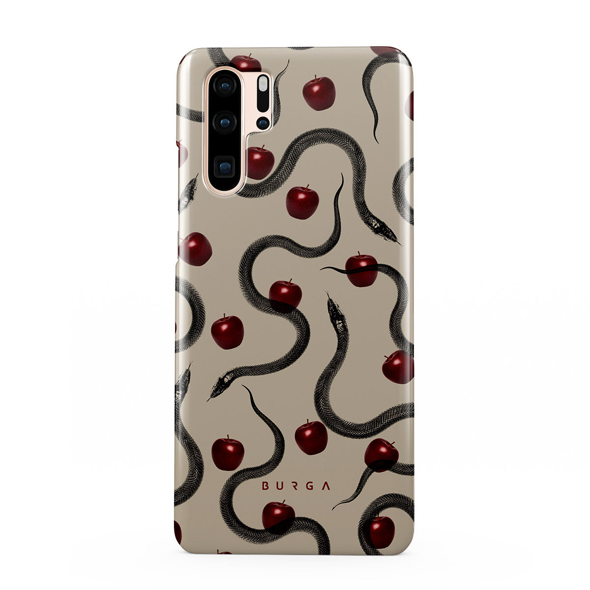 Ce design présente : des pommes rouges brillantes, des serpents enroulés, des tons beige.