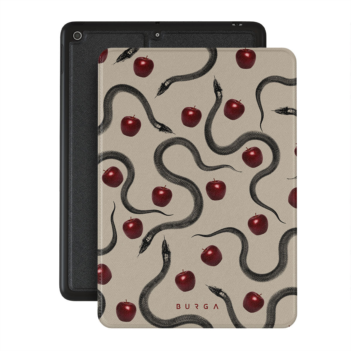 Ce design présente : des pommes rouges brillantes, des serpents enroulés, des tons beige.